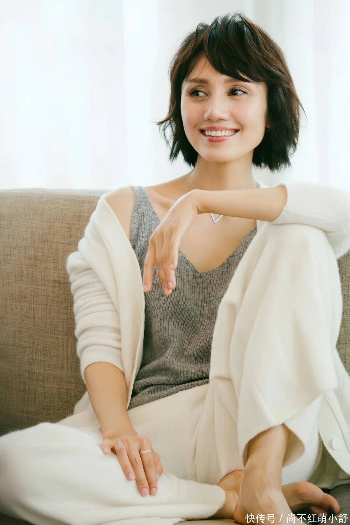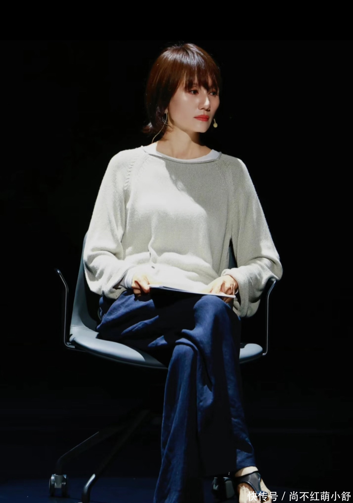 毛衣选款三不原则: 不选oversize(压个子)、不选大logo(显廉价)、不选紧身款(局促)。袁泉的黑色毛衣是“微落肩”版型,肩头比肩线多0.5厘米,藏住40+最头疼的厚肩;衣摆开口直径≤2cm,坐下不堆、起身不鼓。颜色锁定“中性灰度”——雾灰、燕麦、烟蓝,饱和度高一度就留给街拍博主,咱们普通人穿纯色款最衬肤色。