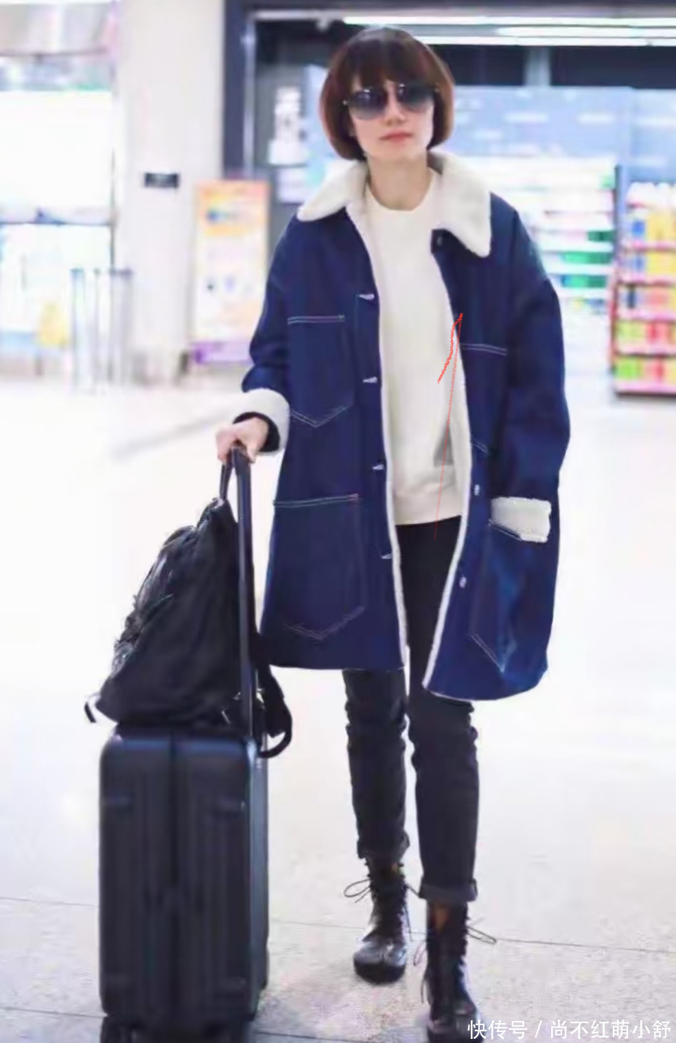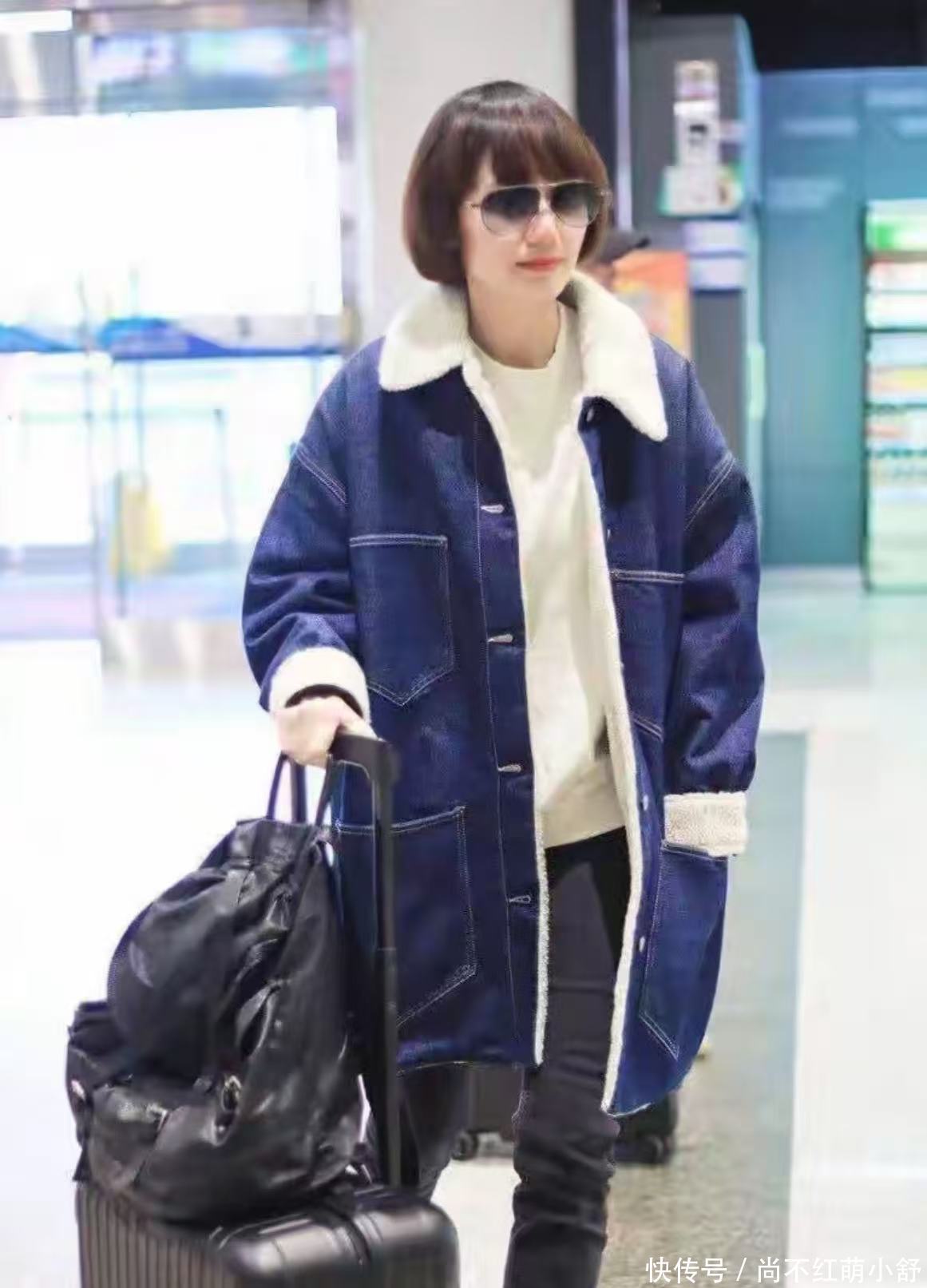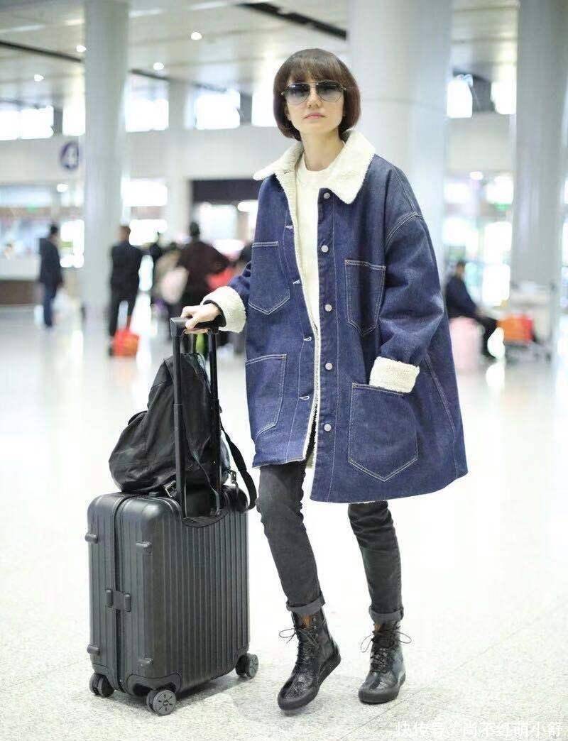 不是所有羊羔毛都显壮! 瞧袁泉这件藏蓝牛仔拼接款直接打破“穿羊羔毛像熊”的魔咒。重点看三个细节:毛绒只在领口、袖口、口袋边缘出现,面积不超过30%;牛仔面料挺括,肩线比实际肩宽多1指,既能塞毛衣又不臃肿;长度刚好盖住臀部,大腿最粗的地方被遮得严严实实,露出的小腿又直又长。