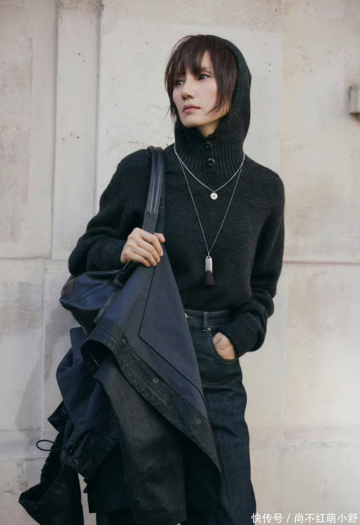 配饰减法法则: 这套全黑look被网友称为“显瘦“”穿搭典范,简约的基础款在颈部项链的点缀下,显得格外优雅大气。